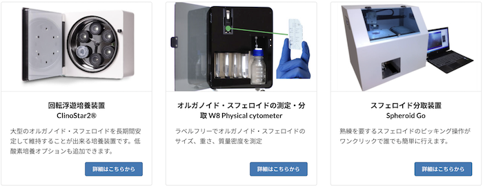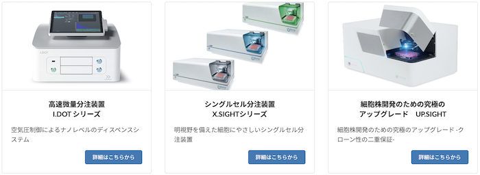 回転浮遊培養装置 ClinoStar2®/3次元培養プレート SPHERICAL PLATE 5D/Droplet Microarray(DMA)/シングルセル分注装置 究極のアップグレード UP.SIGHT/スフェロイド分取装置 Spheroid Go/シングルセル分注装置 X.SIGHTシリーズ/次世代のマイクロプレートウォッシャー C.WASH/次世代のマイクロバイオリアクター C.BIRD/微量分注装置「I.DOT」シリーズ/核酸分解可能な除染システム「steriXcure™」/全光透過率80%「透明フィルムヒーター」